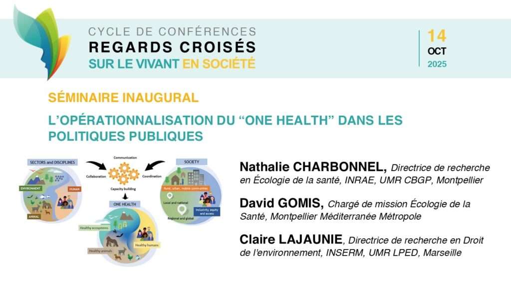 La conférence inaugurale se tiendra le 14 octobre 2025 à la MSH SUD, avec Nathalie CHARBONNEL (écologie de la santé), Claire LAJAUNIE (droit de l’environnement) et David GOMIS (chargé de mission écologie) qui croiseront leurs regards sur L’opérationnalisation du « One Health » dans les politiques publiques.